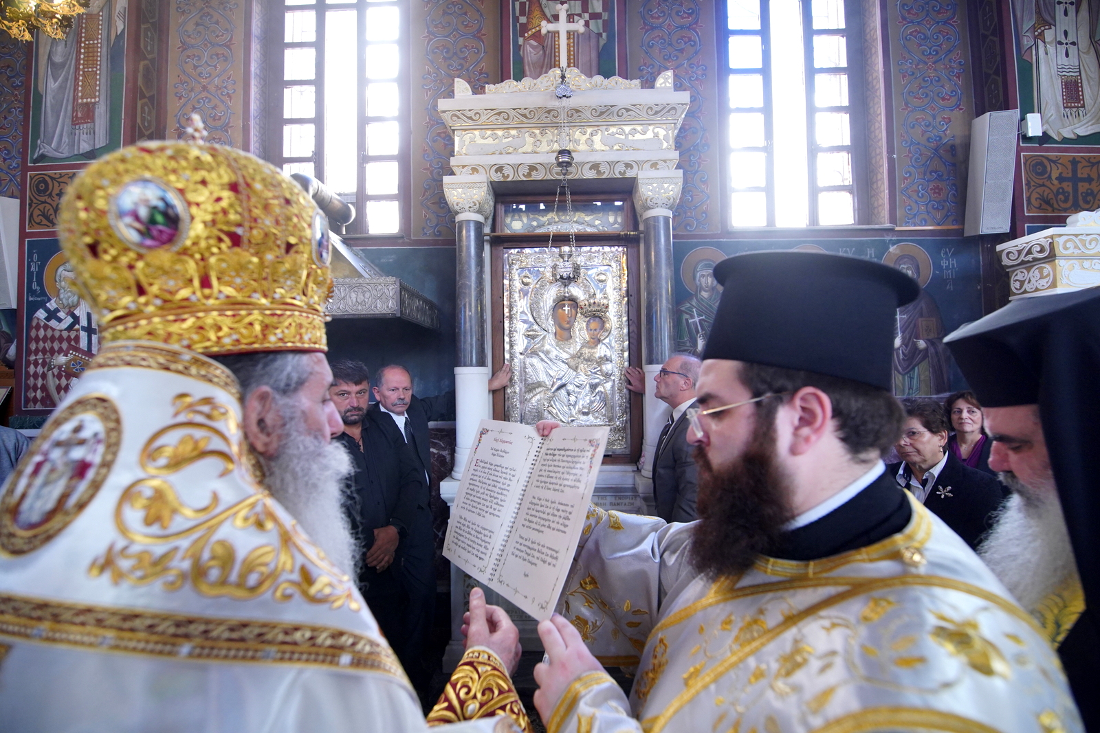 Προ της Απολύσεως, η Ιερά Εικόνα τοποθετήθηκε στο μέσον του Ναού, κατά την Αγιορειτική Τάξη, όπου και θα παραμείνει έως τις 23 Νοεμβρίου, ημέρα κατά την οποία θα ανέλθει και πάλι στο Προσκυνητάριο του Μητροπολιτικού Ιερού Ναού.