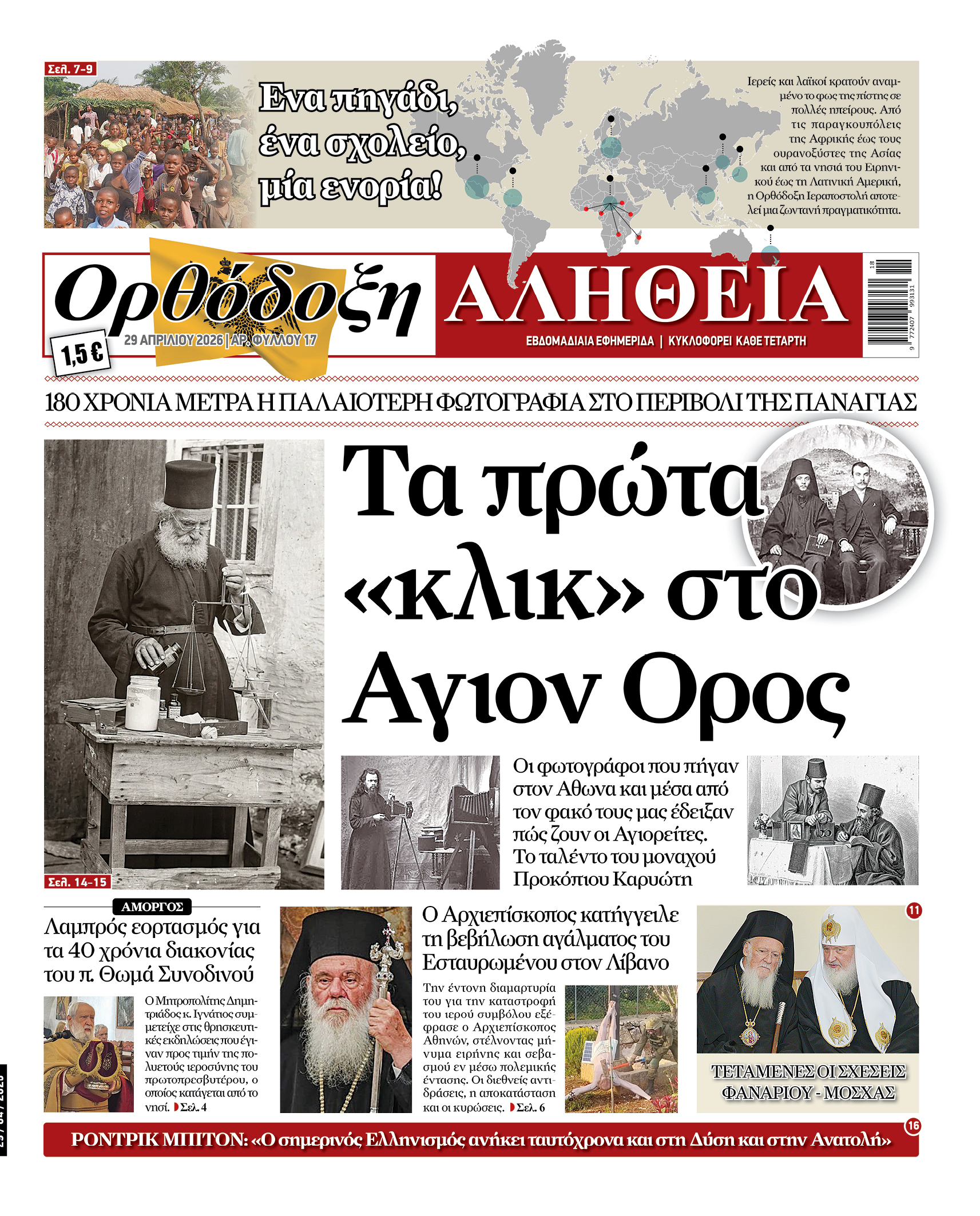 Κυκλοφορεί στις 29 Απριλίου το νέο φύλλο της εφημερίδας «Ορθόδοξη Αλήθεια», με ένα πλούσιο και πολυσύνθετο περιεχόμενο που συνδυάζει ιστορία, πίστη, πολιτισμό και σύγχρονη εκκλησιαστική και διεθνή επικαιρότητα. Με σεβασμό στην παράδοση και ματιά στραμμένη στο παρόν, η «Ορθόδοξη Αλήθεια» συνεχίζει να καταγράφει τα γεγονότα που διαμορφώνουν την πνευματική και κοινωνική πραγματικότητα της εποχής μας.