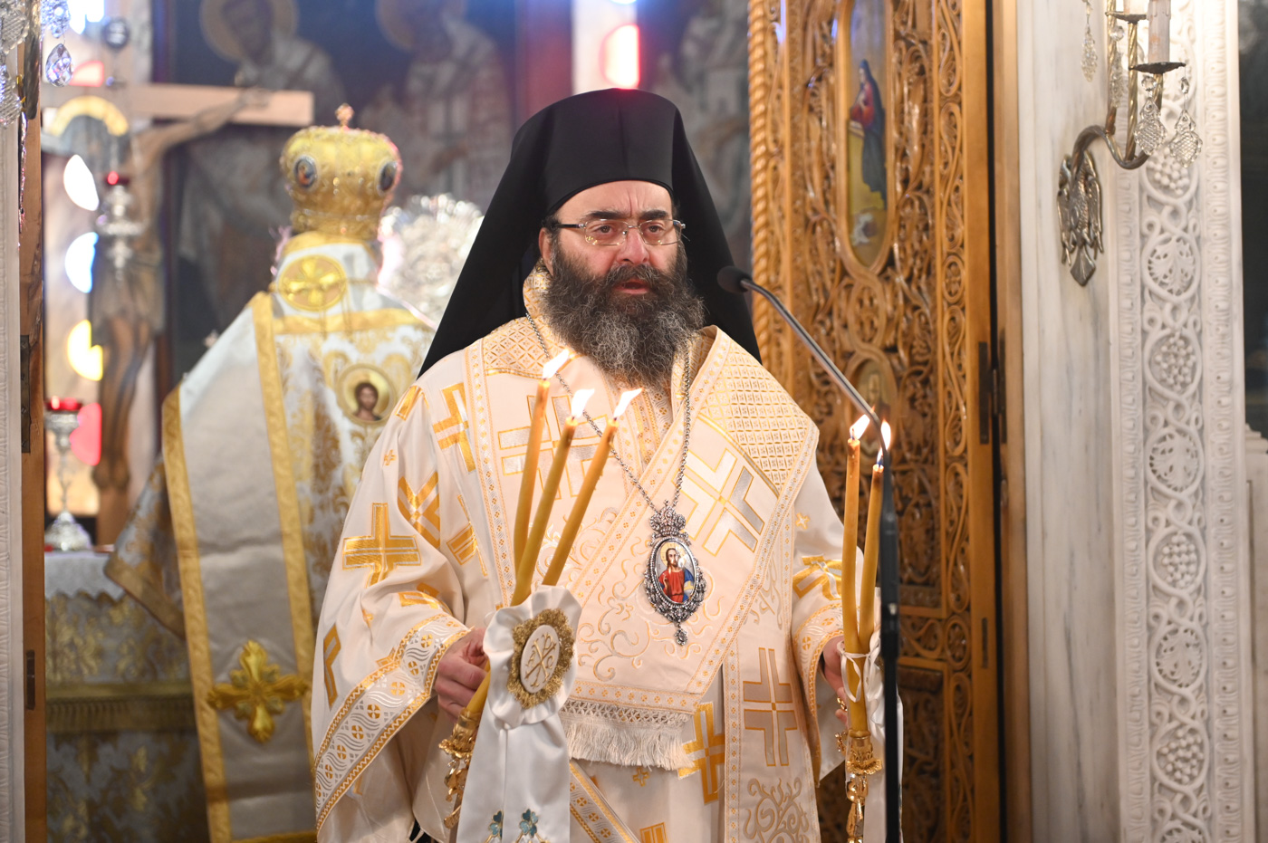Κατά το Κοινωνικό, ο Σεβασμιώτατος κ. Επιφάνιος κήρυξε τον θείο λόγο, επισημαίνοντας ότι η Θεία Λειτουργία αποτελεί πάντοτε μια πασχάλια διάβαση, μια πνευματική πορεία από τον υλικό κόσμο προς την κοινωνία με τον Θεό. Τόνισε ότι ο ιερέας διακονεί ως «μέσος ουρανού και γης», συνδέοντας τους πιστούς με το μυστήριο της σωτηρίας. Αυτή η ιερή αποστολή, όπως υπογράμμισε, αποτυπώθηκε έμπρακτα στη ζωή του μακαριστού π. Ιουστίνου, του οποίου σήμερα τελέστηκε το 40ήμερο μνημόσυνο.