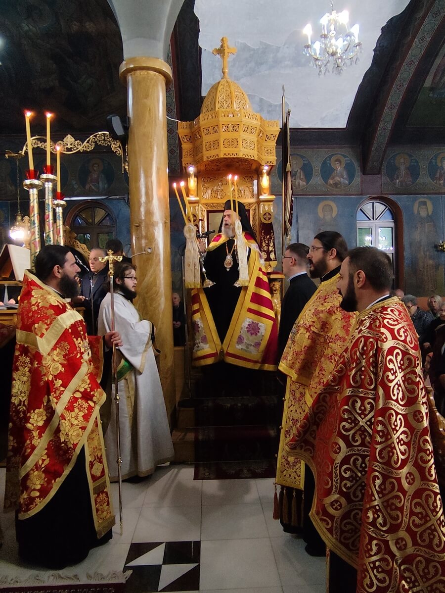 Στη συνέχεια, ο Σεβασμιώτατος χοροστάτησε στην ακολουθία του Εσπερινού επί τη ιερά μνήμη της αγίας και ενδόξου μεγαλομάρτυρος Αικατερίνης της πανσόφου. Ο Εσπερινός τελέσθηκε στον ίδιο Ναό, όπου πανηγυρίζει το Ιερό Παρεκκλήσιο που είναι αφιερωμένο στην Αγία Αικατερίνη. Το πλήθος των πιστών συμμετείχε με ευλάβεια, τιμώντας την σοφή και γενναία μεγαλομάρτυρα της Εκκλησίας μας.